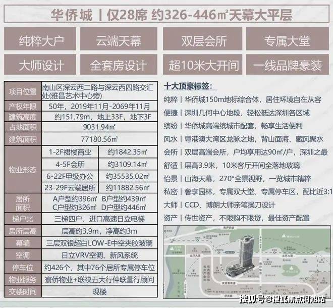 寰侨观邸位于深圳市南山区华侨城核心区域,这一区域以其成熟的配套设施、优越的自然景观资源以及良好的生活便利性而著称,项目规划总占地9031㎡、建面77180㎡、3梯4户、层高3.9米、楼层分布:23-29层、管理费12元/㎡/月、车位1:2.7(76个专属车位)、仲量联行物管顾问+寰侨物业。