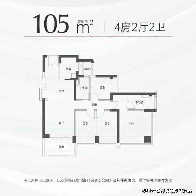 建面约105㎡ 四房户型,采用“南主北次”的独特布局,将客厅、主次卧等核心生活空间悉数置于南向,最大限度吸纳阳光与诗意河景。