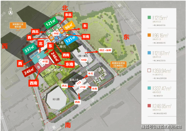 公寓有245-337㎡ 3-4房 665㎡顶复;一栋二单元为住宅项目,59层高,4梯6户,46-56层2梯2户;三单元为公寓,共41层,公寓2梯3户。