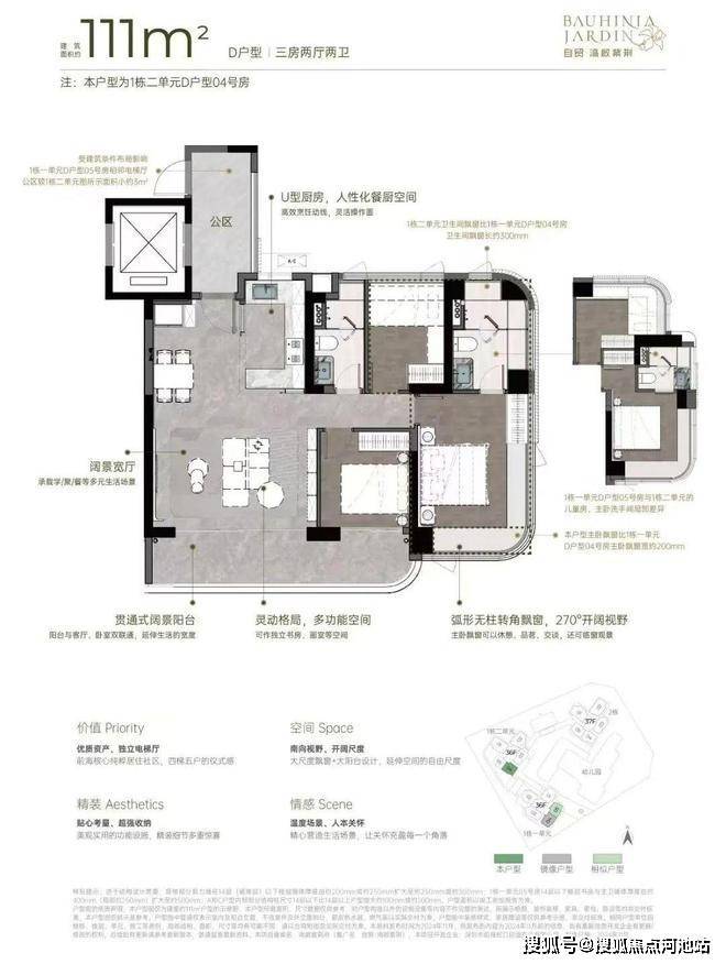 108-111㎡的3房2厅2卫,设计的是竖厅格局,客厅5.15米开间,超宽客厅,LDKB一体化设计,动静分区,三开间朝南,主卧大套间无柱弧形270°转角飘窗,客厅连接次卧出大阳台,U型厨房,卫生间干湿分离,得房率约92-100%(包含赠送),西南或东南朝向。