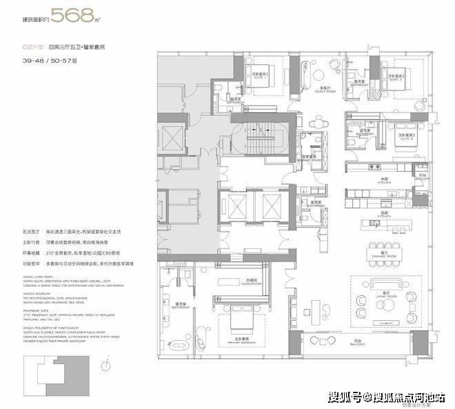 (3-57层)T3栋 四房四卫+家政套间。中西厨分区,餐客西厨一体,带多功能房。端头位置,三面采光。功能完备,房间数充足;实现了主仆双动线;会客观景视野一流。