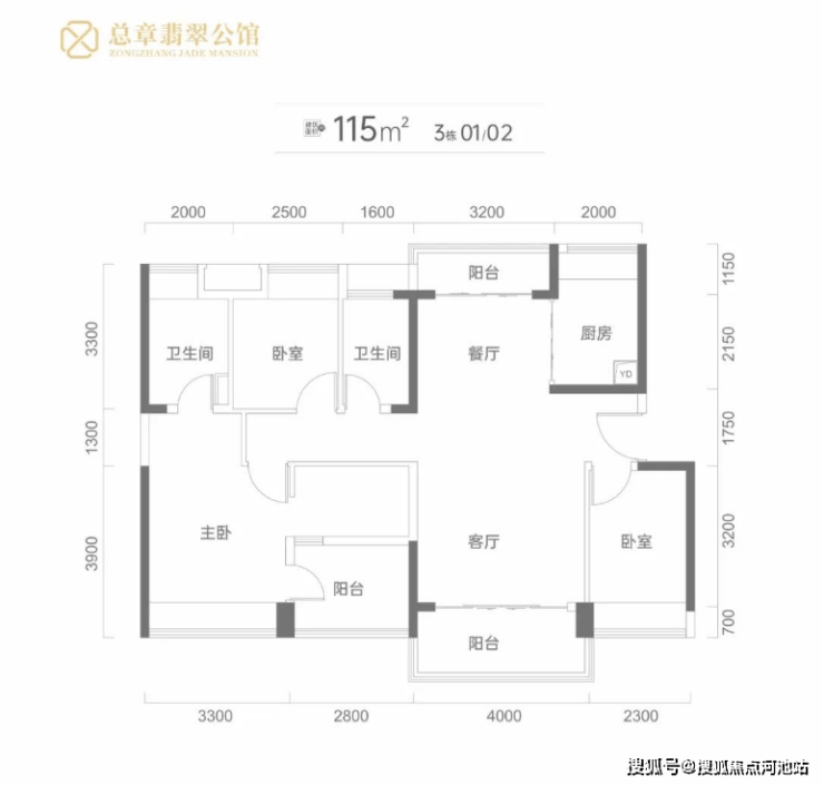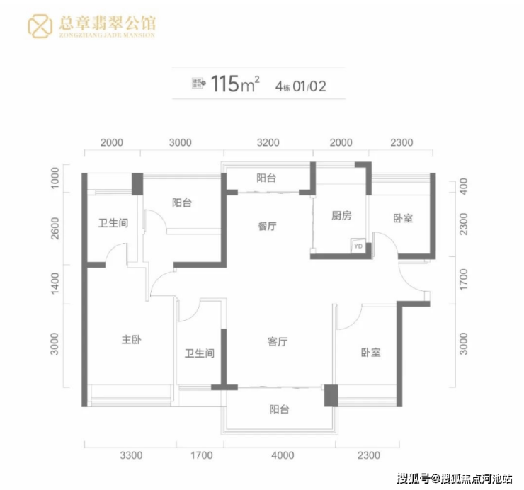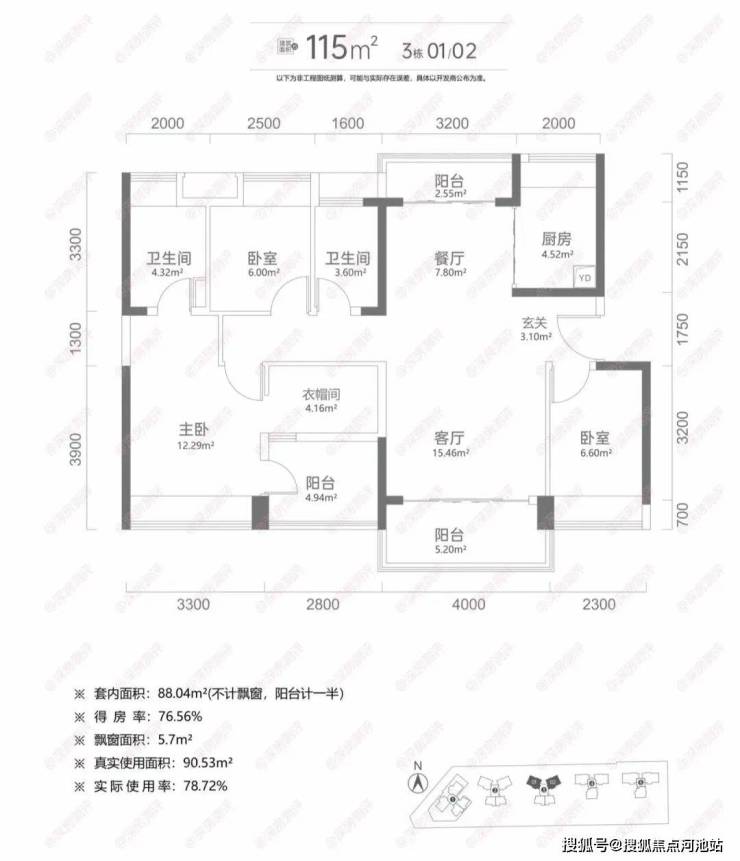 建面115平米:4房2卫,这种户型有3种朝向,3栋01户型西南/东北通透主阳台朝西南,3栋02户型东南/西北通透主阳台朝东南,4栋01/02户型南/北通透户型阳台朝南;