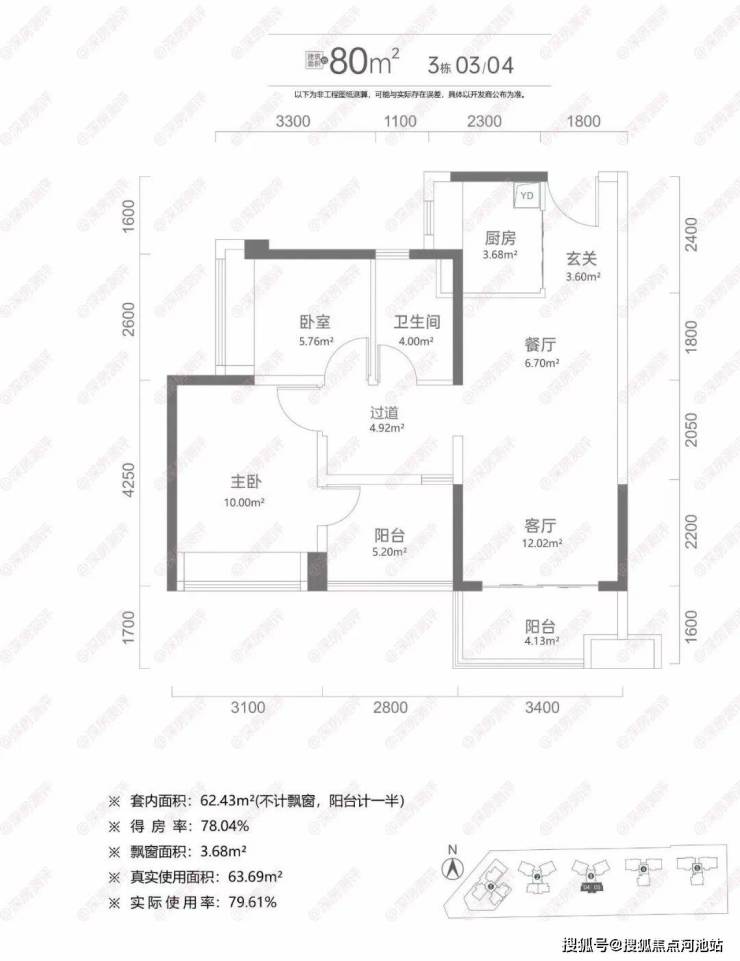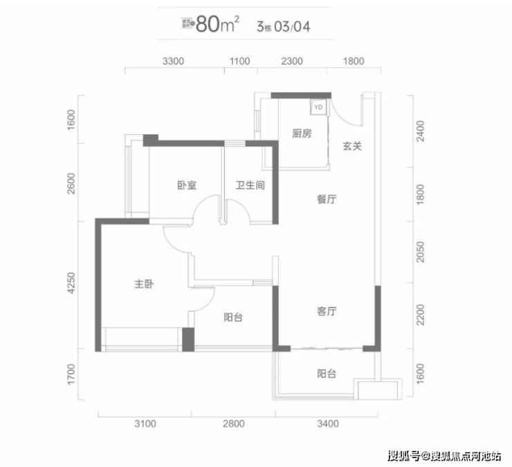 为了偷面积主卧旁设了阳台,实际上就是常规三房一卫户型。餐客厅18.72㎡,客厅开间3.4米,整个动区的观感应该还蛮阔绰。