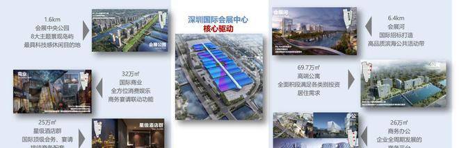 约160万㎡深圳会展中心,约154万㎡会展综合配套,形成包含城市地标、产业总部、商业中心、国际酒店群、产业展馆、精品公寓、生态公园、交通枢纽等复合功能物业群,构建集全球信息交流和消费体验于一体的会展商务平台