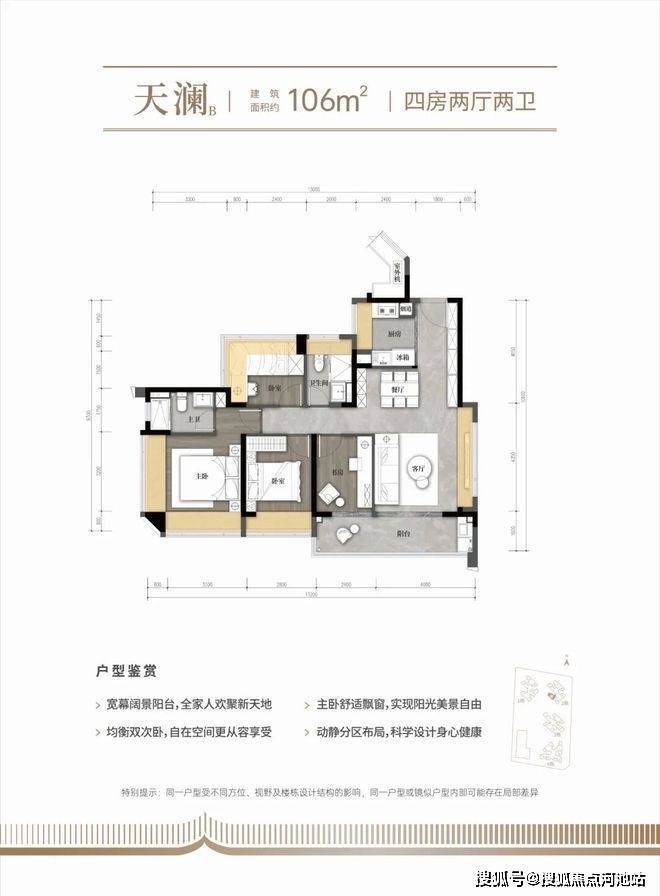 107㎡的4房2厅2卫,竖厅格局,客厅4米开间,LDKB一体化,S墙设计预留冰箱卡槽位,动静分区,U型厨房,卫生间干湿分离。客厅连接次卧出10.24m²观景大阳台东南朝向,得房率约79.1%(不含赠送),加上赠送面积后得房率100.51%。