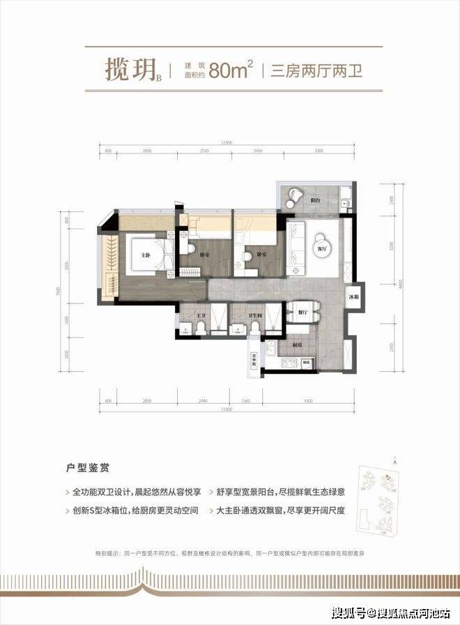 建面80㎡的3房2厅2卫,竖厅格局,客厅3.3米开间,LDKB一体化,S墙设计预留冰箱卡槽位,动静分区,U型厨房,卫生间干湿分离。阳台4.95m²东北朝向,得房率约79.1%(不含赠送),加上赠送面积后得房率94%。