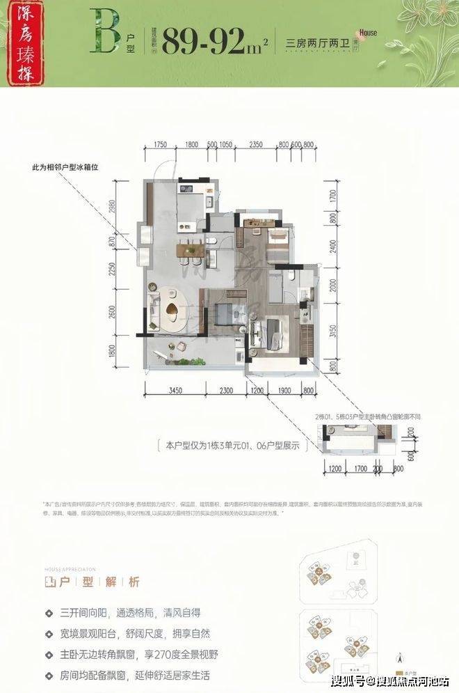 89-92㎡的3房2厅2卫,B户型,设计的是竖厅格局,客厅3.45米开间,LDKB一体化,S墙设计预留冰箱卡槽位,三开间朝南,动静分区,主卧270无边转角飘窗,3个卧室分别做到了主卧18.1㎡/次卧9.44㎡/次卧5.98㎡(包含墙体飘窗),客厅连接次卧出5.75米长的大阳台,U型厨房,公卫三段式分离,得房率约93-99%(包含赠送),西南或东南朝向。