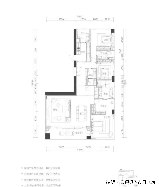 T1B栋D与T1A栋F户型格局相似,但是终于把“中央公卫”去掉了,换成吧台,明显协调了许多。东端头无遮挡,270°景观,适合看日出。
