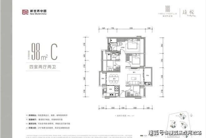 98㎡的4房2厅2卫(C户型),设计的是竖厅南北通透格局,客厅3.35米开间,客餐厅分离化设计,四开间朝南,分别做到了主卧15.7㎡/次卧11.2㎡/次卧7.85㎡/次卧7.42㎡(包含墙体飘窗),U型厨房,卫生间干湿分离,南北双阳台,大阳台约5.36㎡西南或东南朝向。