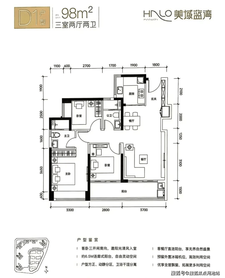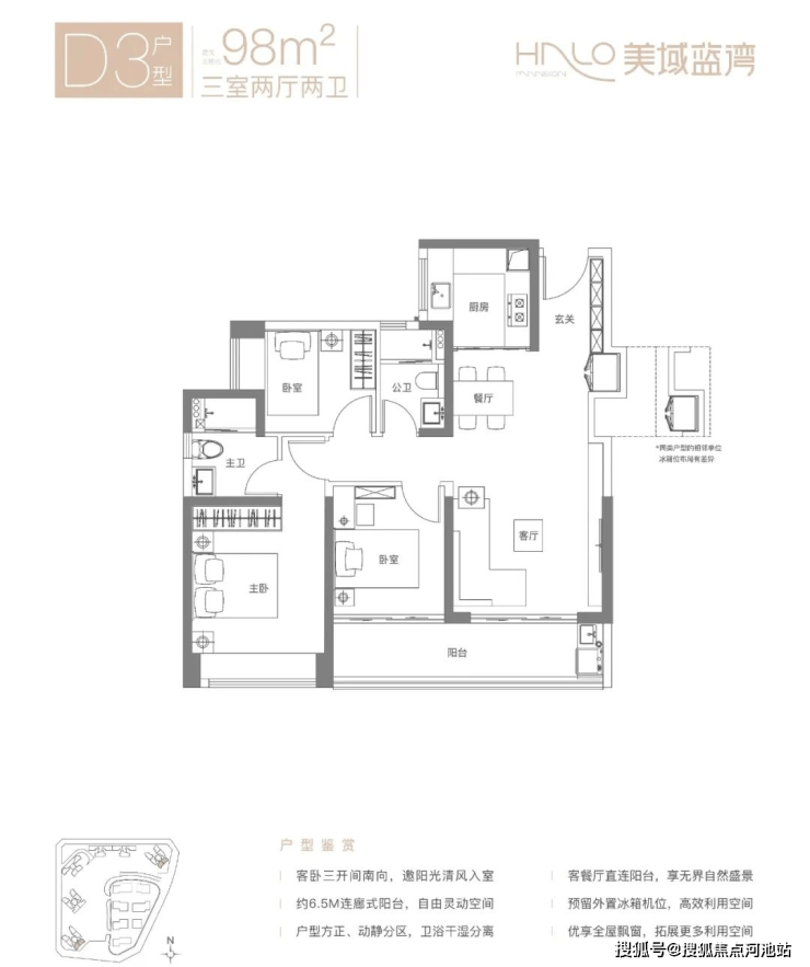 D1户型-98㎡的3房2厅2卫,设计的是竖厅格局,客厅连接次卧出阳台(有6.5米长),三开间朝南,S墙设计预留冰箱位,U型厨房,得房率:80.12%(不含赠送),有西南向或东北朝向。