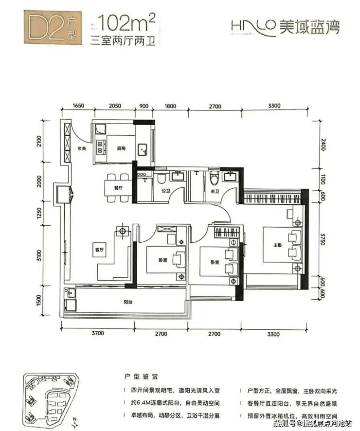 D2户型-102㎡的3房2厅2卫,设计的是竖厅格局,客厅连接卧室出阳台(有6.4米长),四开间朝南,S墙设计预留冰箱位,主卧双飘窗南北对流,U型厨房,得房率:80.11%(不含赠送),有东北向或西南朝向。