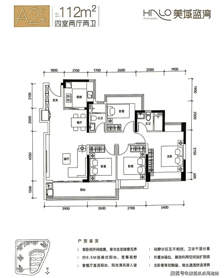 A2户型-112㎡的4房2厅2卫,设计的是竖厅格局,客厅连接次卧出阳台(有6.5米长),四开间朝南,S墙设计预留冰箱位,主卧双飘窗南北对流,U型厨房,得房率:80.12%(不含赠送),有西南或东北朝向。
