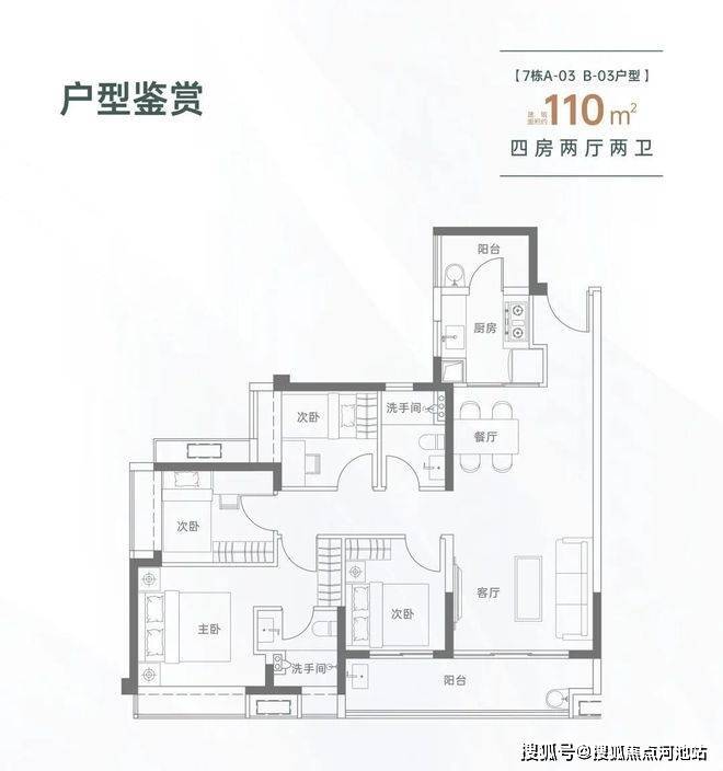 110㎡的4房2厅2卫,设计的是经典竖厅格局,进门入户玄关,LDKB一体化设计,四开间朝南,动静分区,客厅连接次卧出大阳台,L型厨房还带1个生活阳台,卫生间干湿分离,得房率约82%(不含赠送),东南朝向。