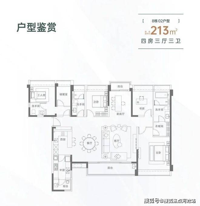 213㎡的4房3厅3卫,设计的是横厅南北通透格局,一梯一户,进门入户玄关,LDKB一体化设计,四开间朝南,双阳台通透,主卧大套间设计,还配有保姆独立套房,中西型多功能厨房,卫生间干湿分离,得房率约82%(不含赠送),阳台主朝东南向。