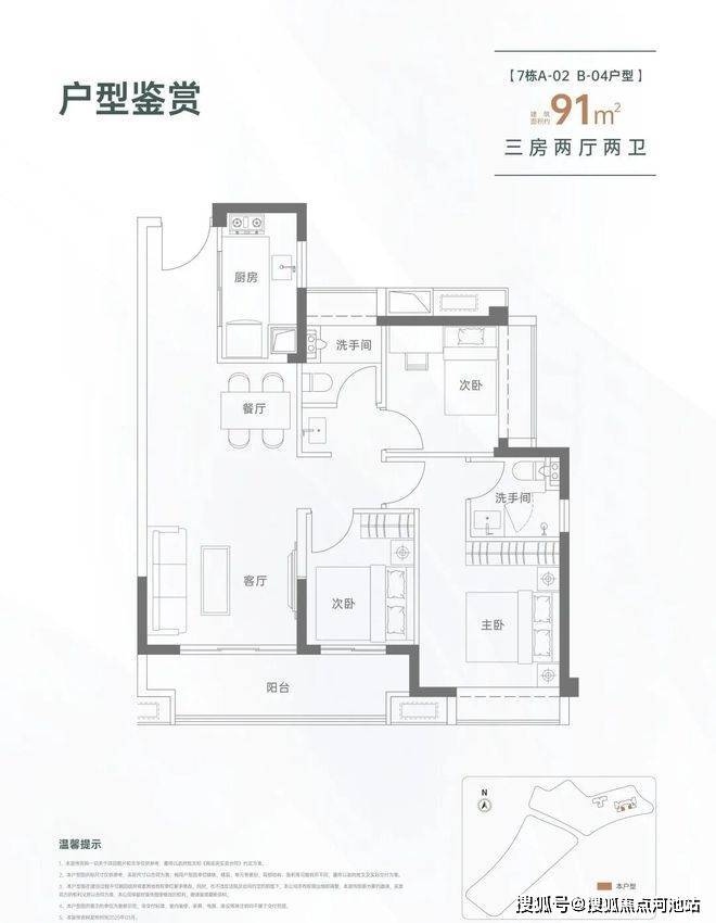 91㎡的3房2厅2卫,设计的是经典竖厅格局,进门入户玄关,LDKB一体化设计,三开间朝南,动静分区,客厅连接次卧出大阳台,L型厨房,公卫三段式分离,得房率约82%(不含赠送),东南朝向。