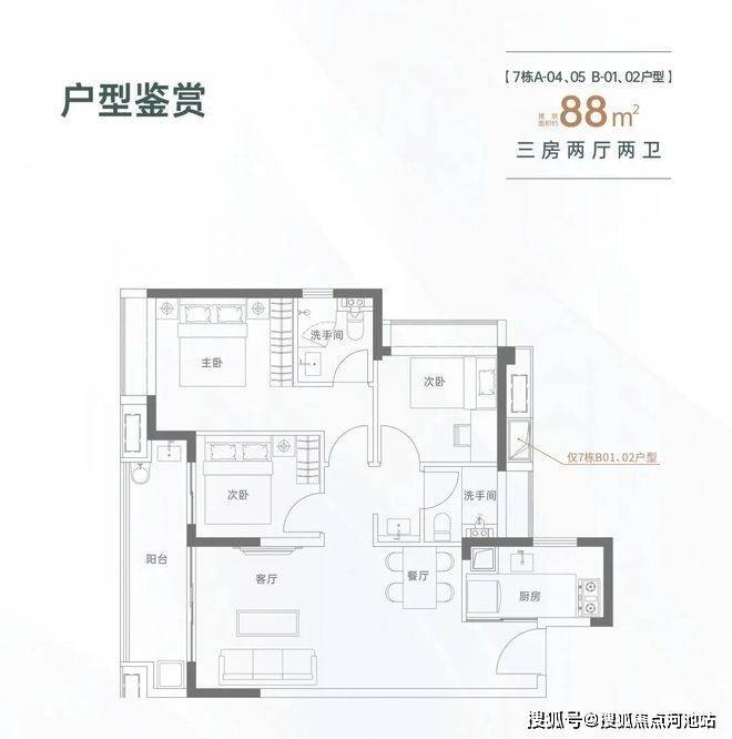 88㎡的3房2厅2卫,设计的是经典竖厅格局,进门入户玄关,LDKB一体化设计,动静分区,客厅连接次卧出大阳台,L型厨房,公卫三段式分离,得房率约82%(不含赠送),西南或东北朝向。