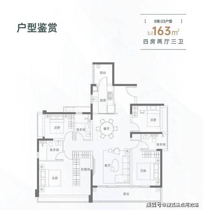 163㎡的4房2厅3卫,设计的是竖厅格局,一梯一户,进门入户玄关,LDKB一体化设计,三开间朝南,双主卧套房,客厅连接次卧出大阳台,L型厨房还带1个生活阳台,卫生间干湿分离,得房率约82%(不含赠送),东南朝向。