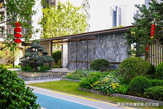 社区大门全金属门楼恢宏大气,重要节点构筑物采用蓝黛灰天然大理石,往里走就能看到,黑金沙整石定制打造的中轴线水景、两边是错落有致的花境、以及高大挺拔的单杆朴树。高奢石材铺装的步道和墙面,处处透露的都是高级感。