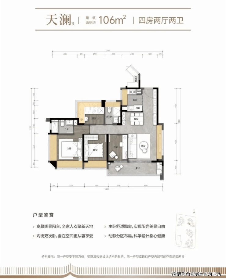 作为项目的改善旗舰,该户型瞄准多孩家庭或三代同堂的需求。横厅格局下,约6米客餐厅开间搭配近6.7米阳台,气场十足。四房布局方正,主卧为套房设计,在控制总价的同时,一步到位满足全周期家庭居住需求。