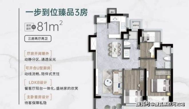 设计的是竖厅格局,客厅3.05米开间,LDKB一体化,S墙预留冰箱卡槽位,动静分区,U型厨房,卫生间三段式干湿分离还带1个设备平台,得房率约91%(包含赠送),实用面积约73.71㎡,正东或正南朝向。