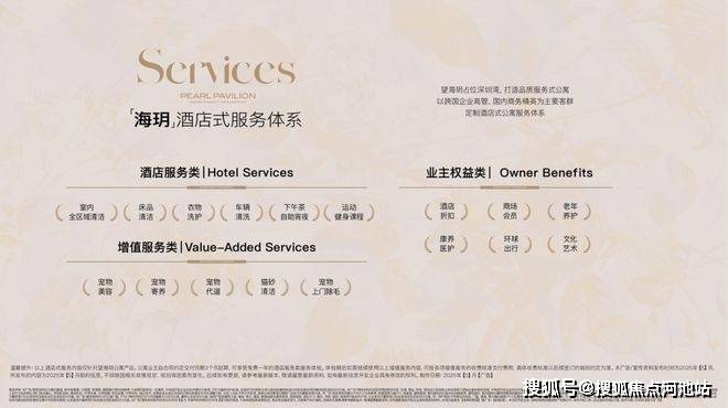 基于这个服务体系,提供了酒店服务类、业主权益类、增值服务类三大板块服务,其内容已远超常规物业管理范畴。