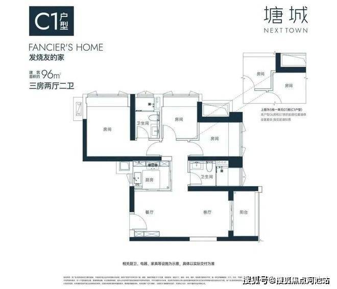 96㎡的3房2厅2卫,C1户型,5栋1单元06/07户型,设计的是竖厅格局,进门入户玄关,客厅3.3米开间,得房率约80%(包含赠送),东北或西南朝向。