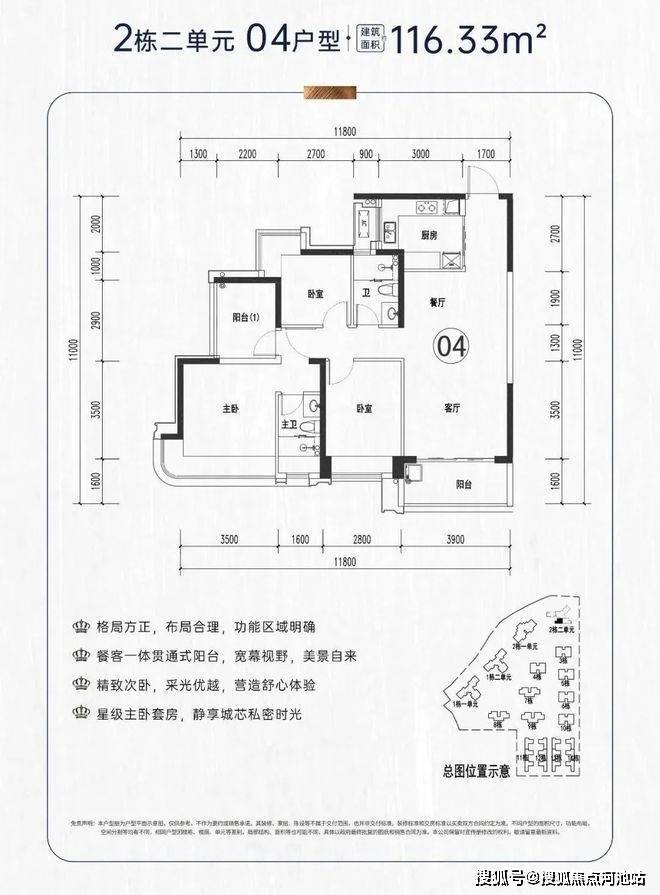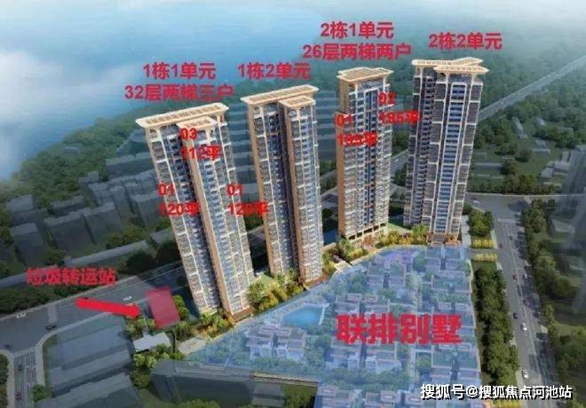 由4栋高层住宅和12栋联排别墅组成,共380套。其中,112-195㎡住宅348套,约210-300㎡双联别墅28套,楼王复式4套,南北朝向。
