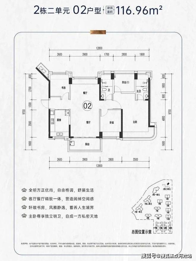 项目容积率2.6,停车超1:1,三梯四户。高层分布于1栋2单元、2栋2单元。其中112平和120平的户型是3+1房,195平的户型是4+1房。