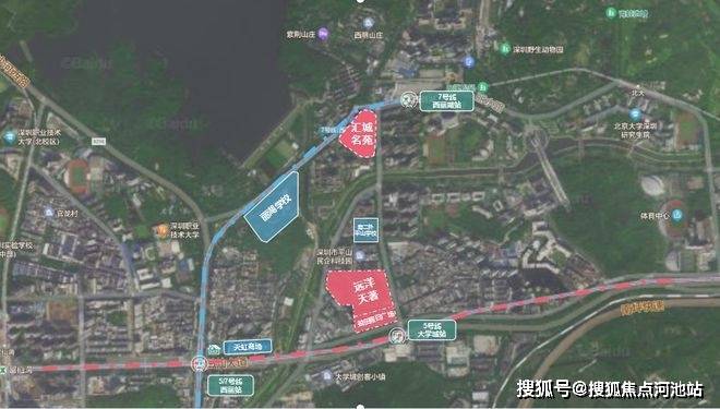 汇城茗院位于南山西丽片区,距离7号线西丽湖站不到200米,西北处紧挨着西丽湖。
