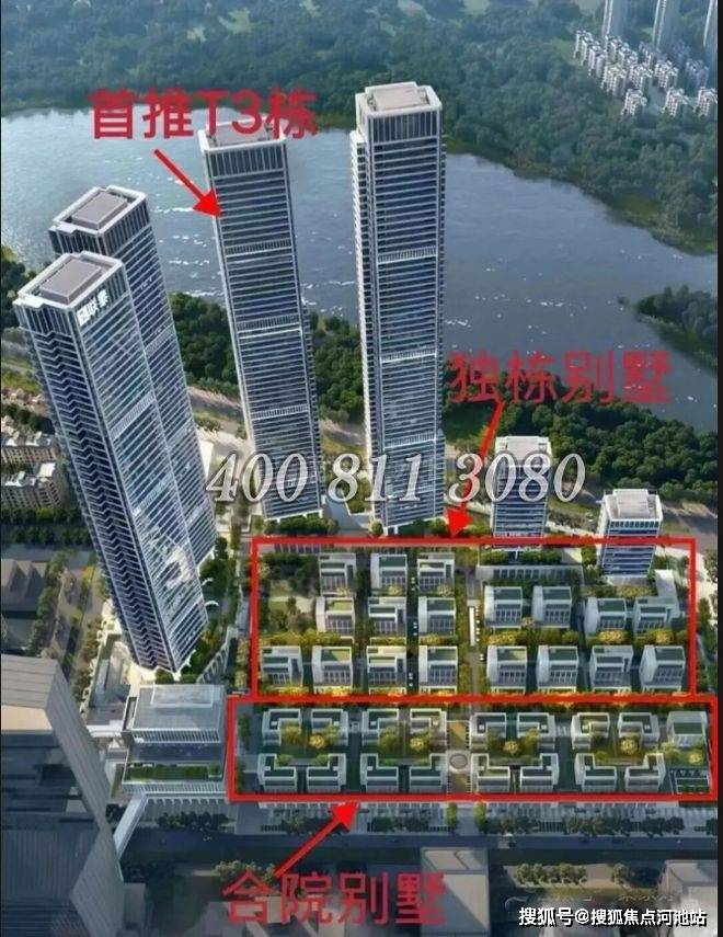 业态组成:4栋51-63层公寓(层高3.6-3.9米,含388米地标主塔T1)、2栋高层办公楼、19套独栋董事公馆、16套合院别墅及约1.4万㎡高端定制商业