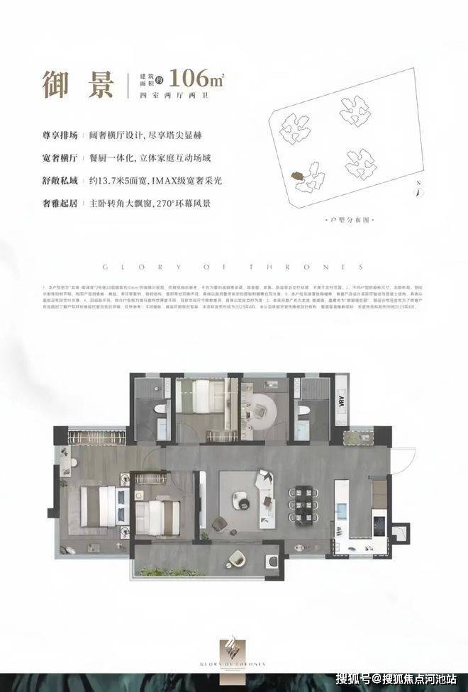 106平级产品是最具性价比的产品,四房设计,享受套房主卧,拥有120平级的连续开窗面,全屋开窗面达约13.7米,极大程度保证全屋采光通透。