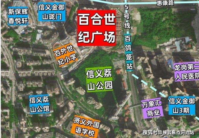 百合世纪广场,位于深圳市龙岗区布吉街道惠康路与翔鸽路交汇处,家门口是5号地铁线“百鸽笼站”,北侧是万科红,南侧毗邻百外世纪小学,荔山公园,周边多为小区住宅,居住氛围浓厚,布吉万象汇距离约300米。