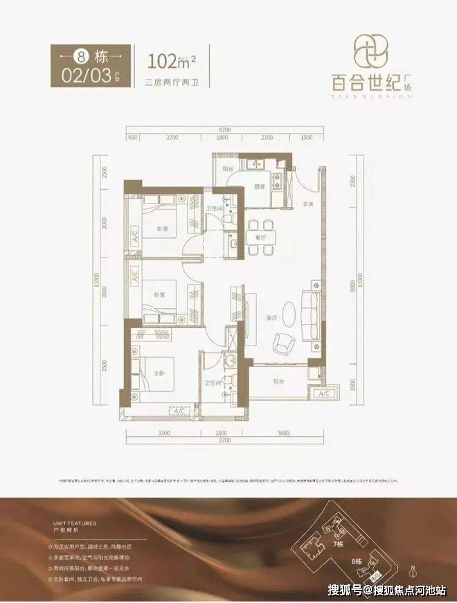 8栋102㎡-3房2卫,折后总价606-645万/套。