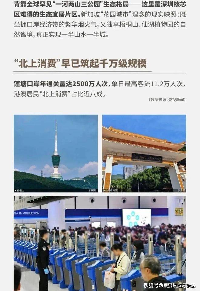 这一独特地理位置赋予项目两大核心优势:一是生态资源丰富,背靠梧桐山麓,周边环绕仙湖植物园等67个公园,3km范围内负氧离子浓度全市前列,为居民提供天然氧吧般的居住环境;二是跨境便利性突出,通过莲塘口岸可快速通达香港,口岸开通后客流量持续攀升,2024年出入境人员突破2000万人次,是深港"东进东出"战略的重要枢纽。项目所在区域被官方定位为"深港深度融合发展的试验区、先行区",未来随着深港合作深化,这一区位价值将进一步凸显。