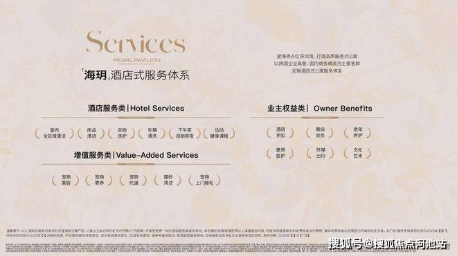 基于这个服务体系,提供了酒店服务类、业主权益类、增值服务类三大板块服务,其内容已远超常规物业管理范畴。