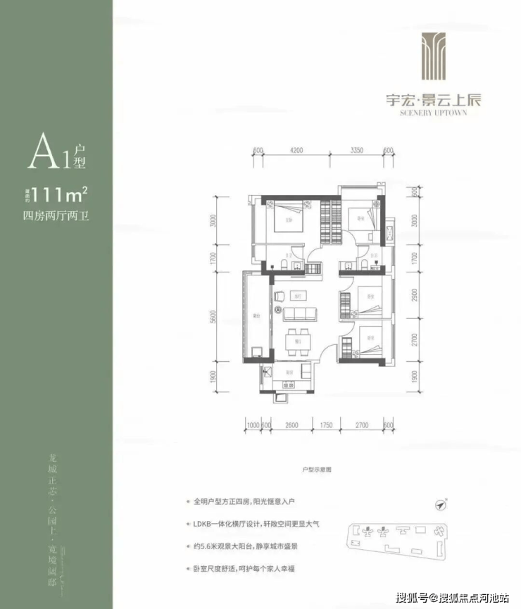 111㎡的4房2厅2卫,设计的是横厅南北通透格局,客餐厅5.6米开间,LDKB一体化,五开间朝南,4个卧室分别做到了3米/3米/2.9米/2.7米的宽度,客厅连接餐厅位出5.6米长的大阳台,L型厨房,公卫生三段式分离,得房率约76%(不含赠送),阳台主朝西南向。