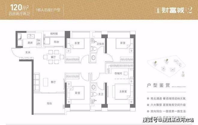 120㎡的4房2厅2卫,设计的是竖厅南北通透格局,双阳台设计,客厅3.7米开间,4个卧室分别是3.2/3.2/2.75/2.75米的宽度,U型厨房,得房率:88.36%(包含赠送),阳台主朝东南、西北、东北向。