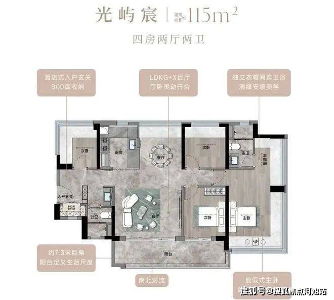 115㎡的4房2厅2卫,设计的是竖厅南北通透格局,进门入户玄关,客厅4.45米开间,餐客厅分离设计,客厅连接次卧出10.87m²的观景大阳台,L型中式+岛台灵动式厨房,公卫三段式干湿分离,得房率约78.27%(不含赠送),阳台主朝东南或西南向。靓点:南北对流+7.25米长超大观景南向阳台,超大主卧+270°无柱转角飘窗