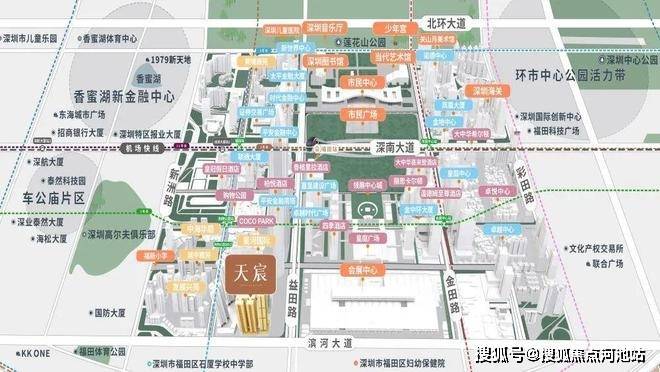 天宸(佳园)项目位于深圳市福田中心区滨河大道与民田路交汇处东北角,东边是会展中心,东北面能看见平安金融中心大楼,西侧是发展兴苑东区,南邻滨河大道,北临星河国际。总的来看,项目处于绝佳C位!