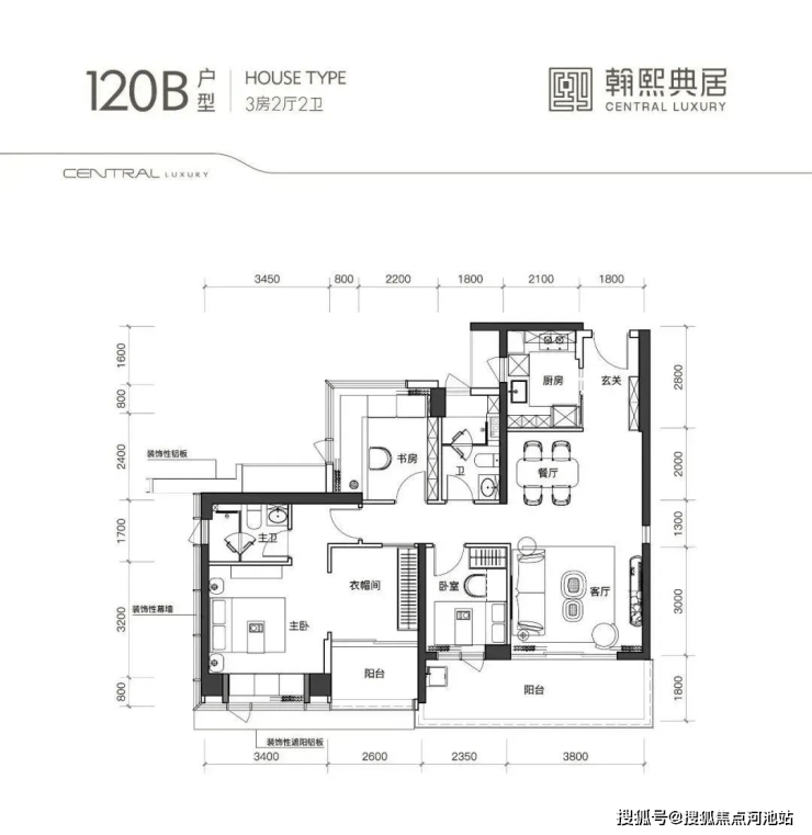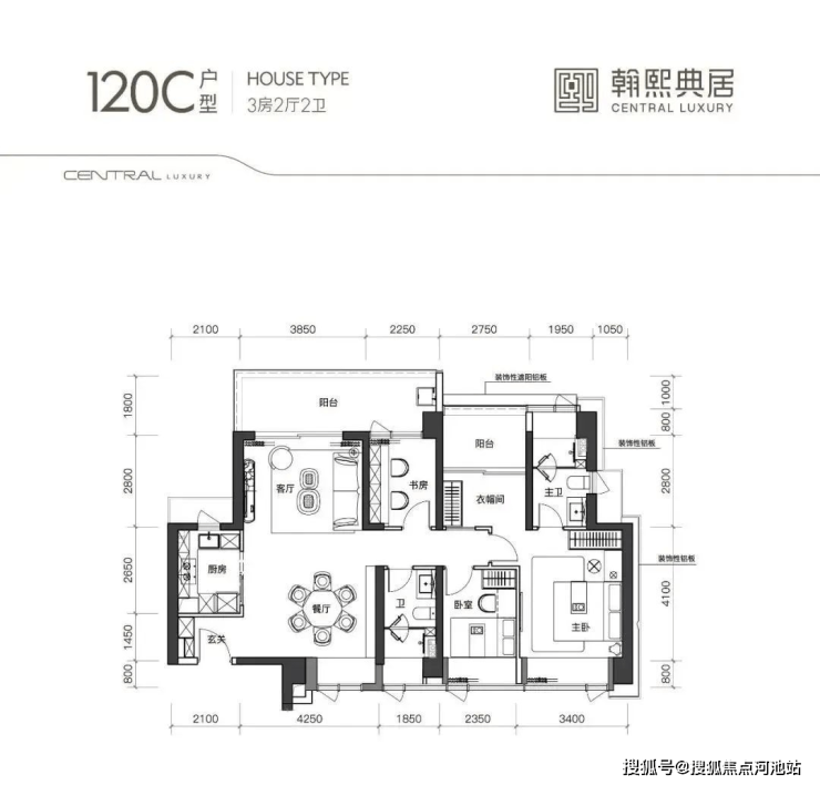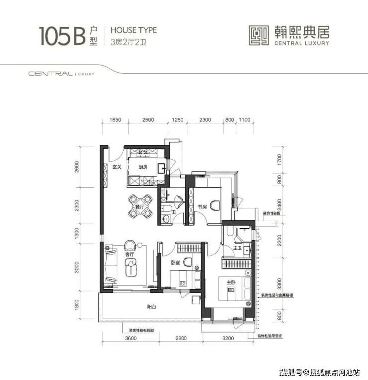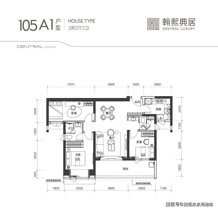 105A1户型,竖厅类双龙抱珠格局,客厅开间3.6米,阳台开间6.5米,尺度非常奢阔,U型厨房,公卫三段式分离。
