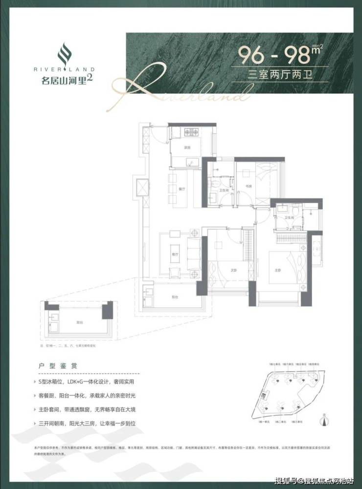 98㎡的3房2厅2卫,1-7单元05户型,设计的是经典竖厅格局,餐客厅一体化,客厅3.5米开间,S墙设计预留冰箱位,三开间朝南,3个卧室分别做到了主卧12.39㎡/次卧9.54㎡/次卧6.11㎡(实测面积,去掉墙体),U型厨房,得房率:73.86%(不含赠送),阳台1.5米进深,东南朝向。