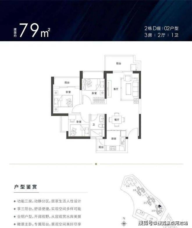 79-81㎡的3房2厅1卫,设计的竖厅格局,厨房带小阳台,客厅东北朝向,高层可看水库景观。