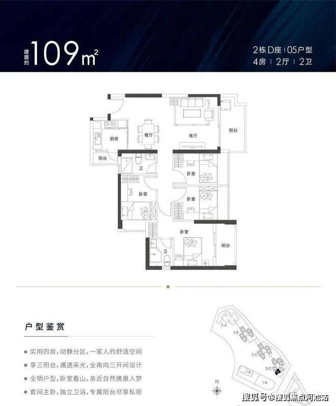 109㎡的4房2厅2卫,设计的竖厅格局,客厅主卧双阳台设计,厨房也带小阳台,四开间朝南,客厅朝东南向。