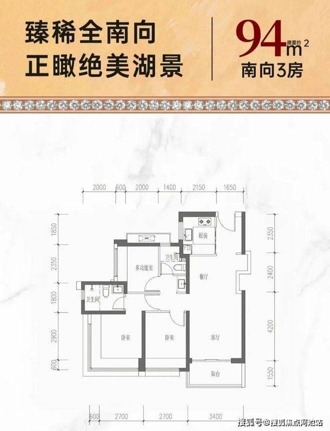 94㎡的3房2厅2卫,设计的是经典竖厅格局,客厅3.4米开间,LDKB一体化,S墙设计预留冰箱卡槽位,动静分区,三开间朝南,分别做到了主卧13.55㎡/次卧9.45㎡/次卧7.28㎡(包含墙体飘窗),U型厨房,公卫三段式干湿分离,得房率约74%(不含赠送),阳台东南朝向约5.27平。套内面积69.94㎡+赠送面积9.65㎡=实得面积79.59㎡,加上赠送后得房率约84.22%。