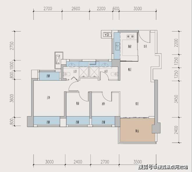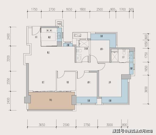 润臻园建面约89平D3+1户型 南北通透设计,空气流通强,客餐厅空间灵活,餐厅位置可改成一个房间使用,270°采光面,9个飘窗设计把得房率提高到100%,主卧南北通,西南向。