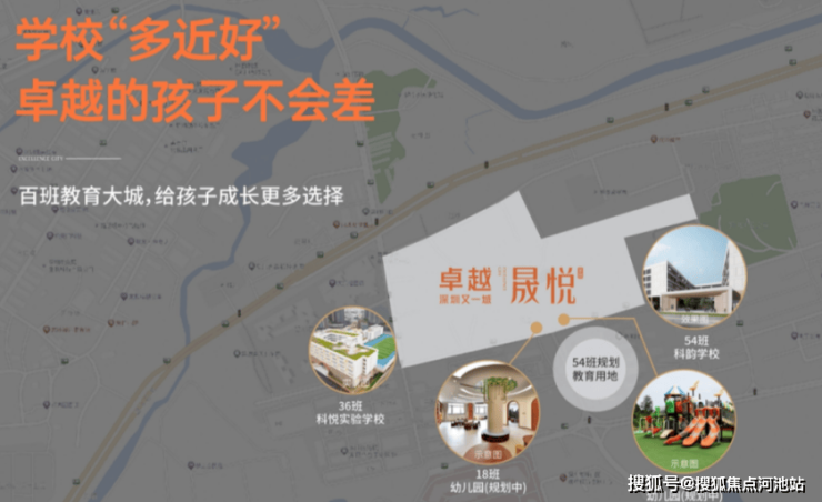 项目自带2所18班幼儿园,周边科韵学校,该校是一所九年制45班公办学校,周边还有科悦小学(30班,已开学),科源实验学校(九年制42班公办学校)、深实验坪山分校(初中)