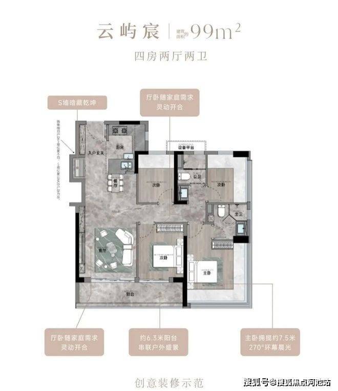 99㎡的4房2厅2卫,设计的是竖厅格局,客厅3.35米开间,LDKB一体化,S墙设计预留双开门冰箱卡槽位,三开间朝南,动静分区,U型厨房,公卫三段式干湿分离,赠送设备平台,得房率约78.27%(不含赠送),客厅连接次卧出9.37m²大阳台西南或东南朝向。靓点:99平做到了4房2卫,主卧270°无柱转角飘窗,厨房烟道外置+额外赠送设备平台,并且是纯南向格局。