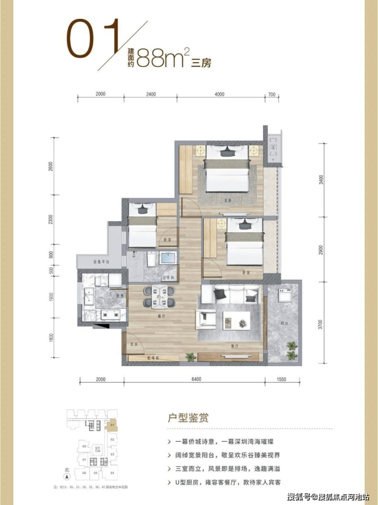 01约88㎡ 3房2厅1卫 总价:约970万 东向