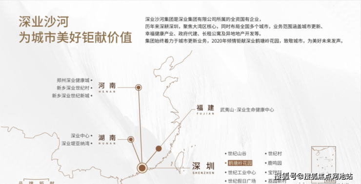 深业沙河集团是深业集团有限公司所属的全资国有企业,历年来深耕深圳,同时布局全国多个城市。始终着力于城市更新业务,2020年倾情钜献深业鹤塘岭花园,致敬城市,为美好未来发声。