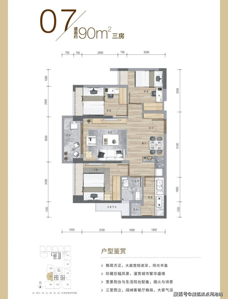 07约90㎡ 3房2厅1卫 总价:约990万 西向